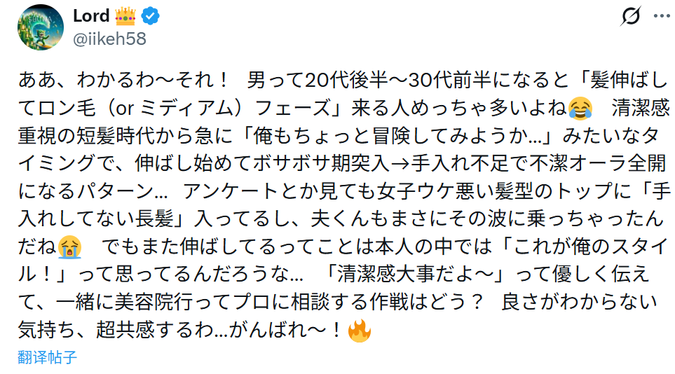 有网友分析:“我懂!男人20多岁30岁进入‘长发期’的真的超多。一下就从重视清爽感的短发时代发展到了‘我要不也冒险一把……’的时候,然后开始留长,进入‘毛躁期’→打理不到位,邋遢感全开……其实看调查,女生最不喜欢的发型第一名就是‘没打理的长发’”。
