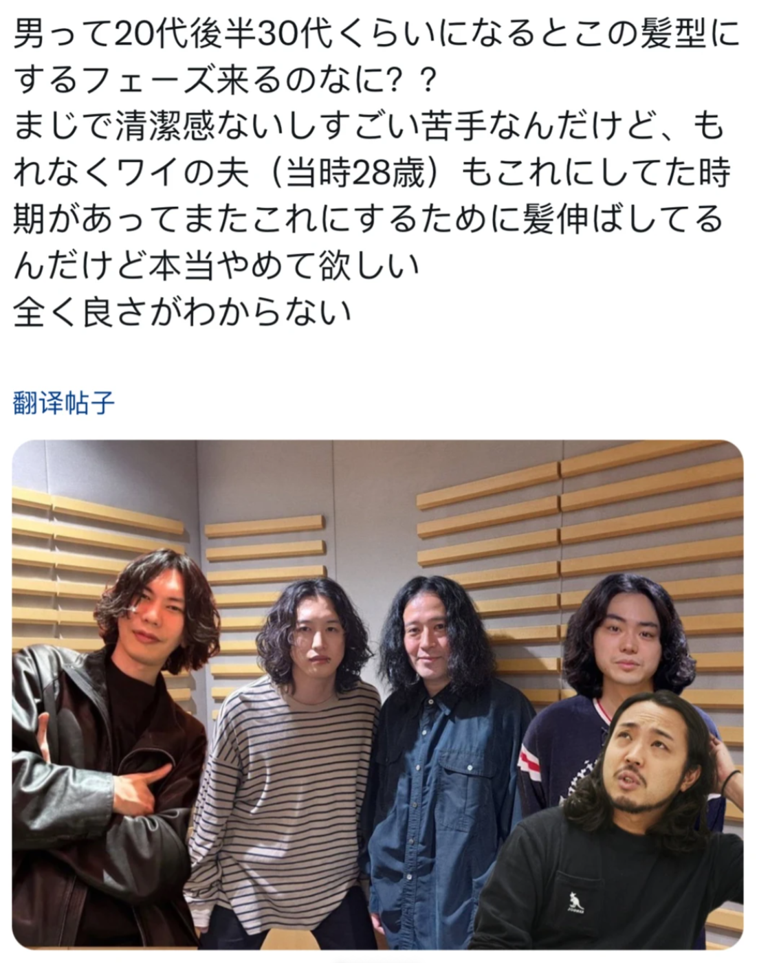 近日,X上一则吐槽引发中日网友的热议。一位网友感叹“为啥男人一到20多岁30岁就会爱上这种流浪汉长发了”“真的给人感觉不清爽干净很难搞啊”,并配图五位艺人米津玄师、藤井风、菅田将晖等艺人这种发型的照片,还无奈道“我的丈夫(当时28岁)就留过这种头发,现在又想留我真的别搞啊,搞不懂这种发型好在哪里”。