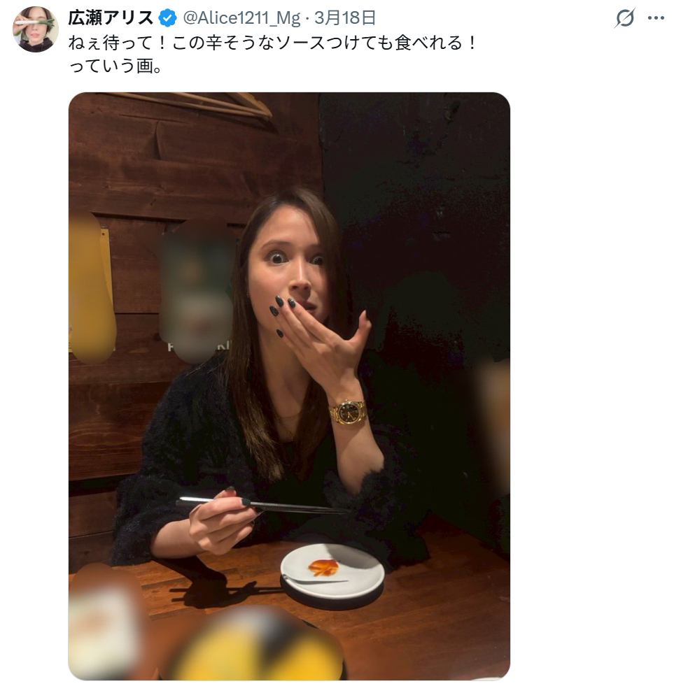 広瀬は、18日のXで箸を手に持ち、目を見開いて驚いたような表情を浮かべ、左手を口に当てるような写真を投稿。《ねぇ待って!この辛そうなソースつけても食べれる!っていう画》とつづった。