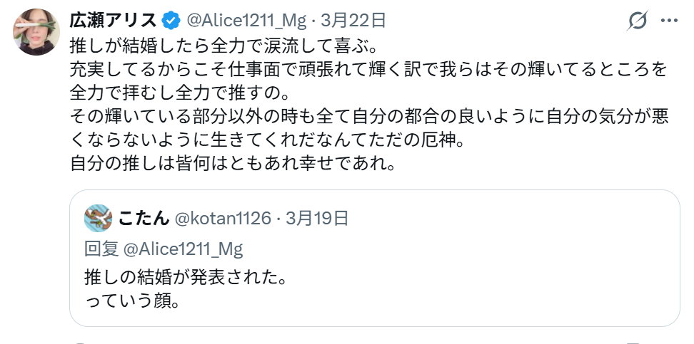この投稿では、《その輝いている部分以外の時も全て自分の都合の良いように自分の気分が悪くならないように生きてくれだなんてただの厄神。自分の推しは皆何はともあれ幸せであれ》と、推しの結婚に理解を示さないファンへの厳しい見解も示している。