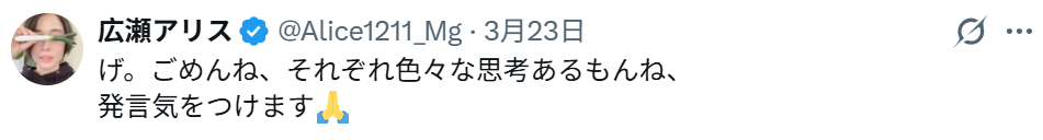 炎上を受けて広瀬は、翌日になり再度投稿。《げ。ごめんね、それぞれ色々な思考あるもんね、発言気をつけます》と反省の弁を綴ったのだ。しかし、その言葉がまたもやファンの反感を買うことに。