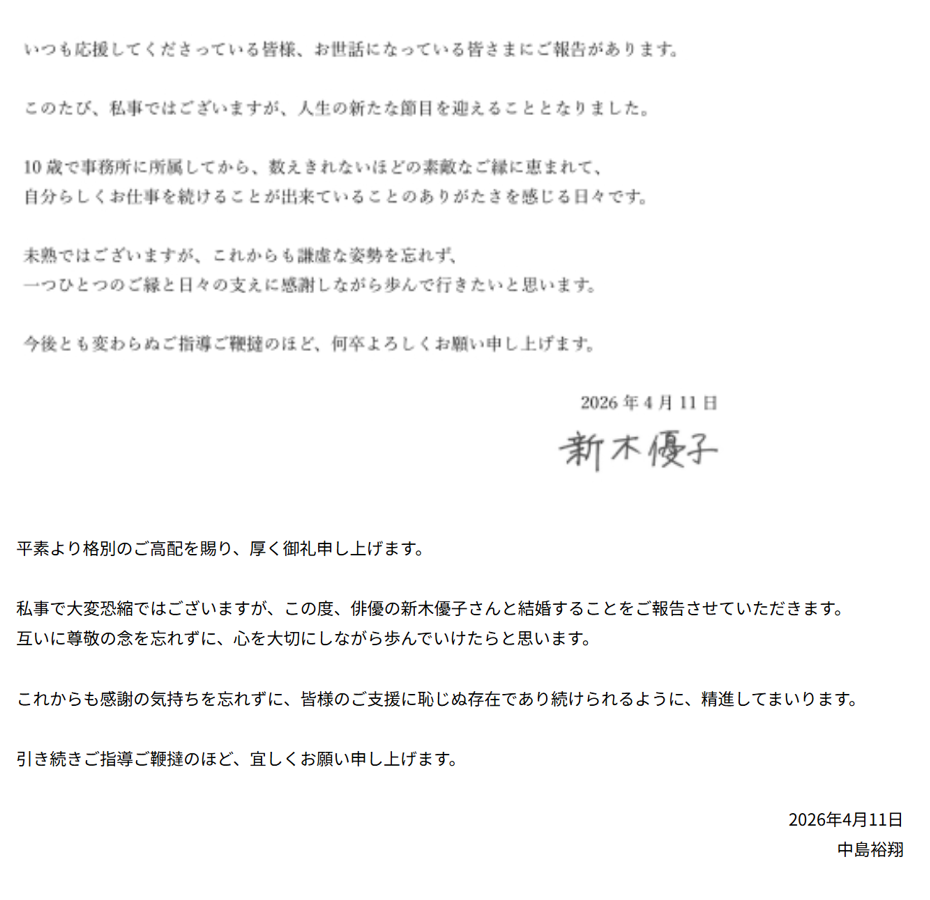 中島は11日、所属のSTARTO ENTERTAINMENT公式サイトで結婚を発表し、「互いに尊敬の念を忘れずに、心を大切にしながら歩んでいけたらと思います」と誓った。新木も同日、所属事務所公式サイトで結婚を発表し「一つひとつのご縁と日々の支えに感謝しながら歩んで行きたいと思います」と誓いを新たにした。