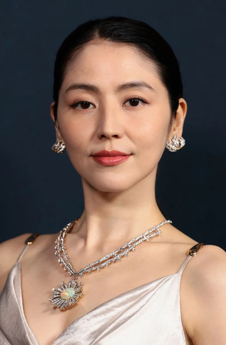 长泽雅美身穿一件银白色修身礼服,深V领口设计展现出她优美的锁骨线条,璀璨的珠宝在其颈部锁骨熠熠生辉。