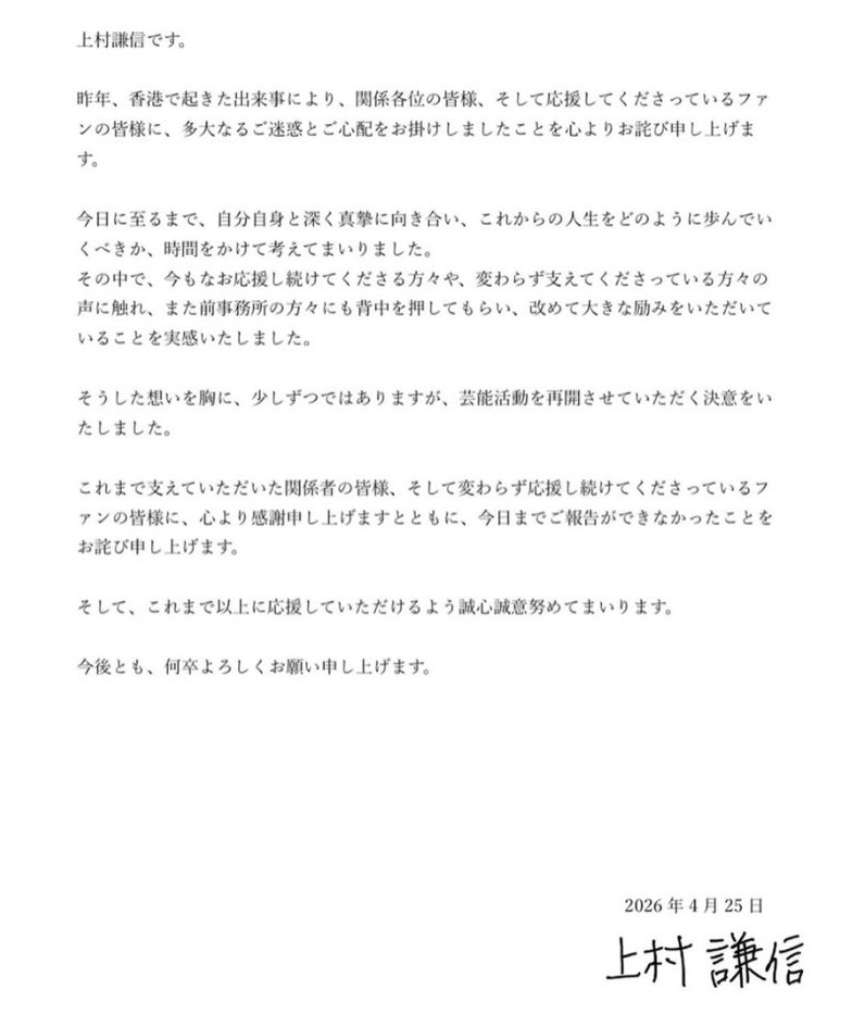 上村は「昨年、香港で起きた出来事により、関係各位の皆様、そして応援してくださっているファンの皆様に、多大なるご迷惑とご心配をお掛けしましたことを心よりお詫び申し上げます」と謝罪。「今日に至るまで、自分自身と深く真摯に向き合い、これからの人生をどのように歩んでいくべきか、時間をかけて考えてまいりました。その中で、今もなお応援し続けてくださる方々や、変わらず支えてくださっている方々の声に触れ、また前事務所の方々にも背中を押してもらい、改めて大きな励みをいただいていることを実感いたしました」とし、「そうした想いを胸に、少しずつではありますが、芸能活動を再開させていただく決意をいたしました」と報告した。