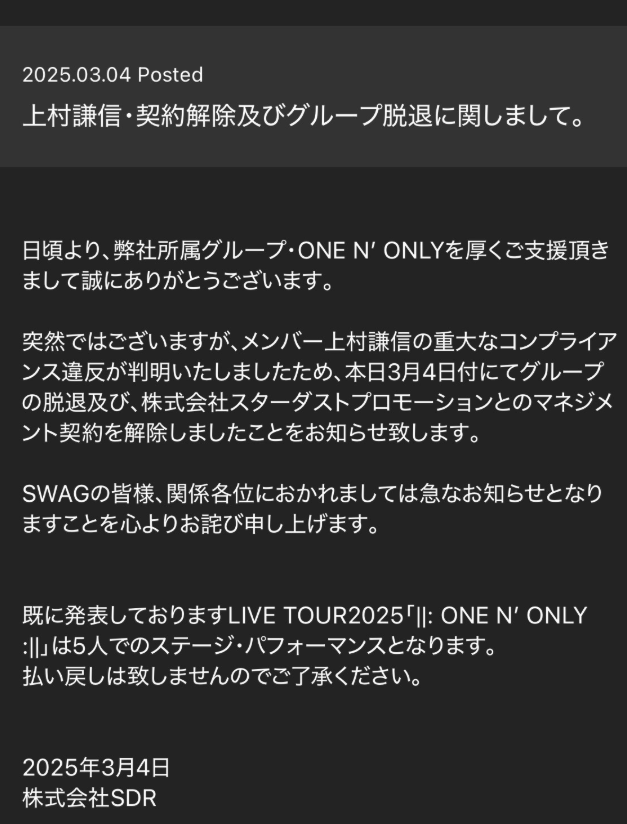 4月25日,原唱跳组合“ONE N’ ONLY”成员上村谦信(26岁)开设Instagram账号,官宣自己将重启演艺活动。去年3月,上村曾因“严重违反合规规定”宣布退出组合,同时与当时所属的经纪公司解除了经纪合同。