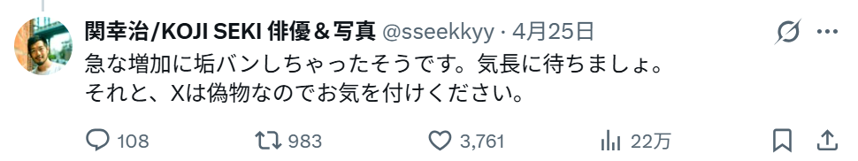 「新たにインスタグラムを開設したという上村さんですが、直後にアカウントが閲覧できなくなってしまったそうなのです。実際に上村さんのアカウントを開くと、《このページはご利用いただけません》と表示されます。関さんは上村さんに確認したのか、Xで《急な増加に垢バンしちゃったそうです》と事情を伝えていました。上村さんの活動再開を心待ちにしていたファンからのフォローが殺到したのか、もしくは“アンチ”よる通報が相次いだ可能性も考えられるでしょう。とはいえ、突然のハプニングにファンの間でも混乱が広がっています」(前出・芸能関係者)