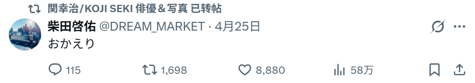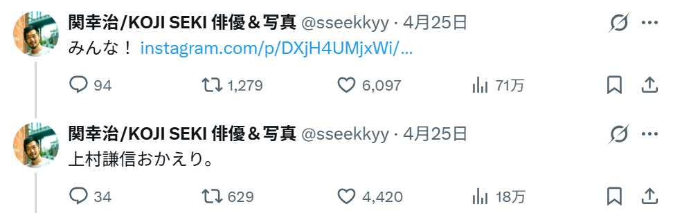 これを受け、上村が主演を務めたドラマ「未成年~未熟な俺たちは不器用に進行中~」で担任教師・菅原大輔を演じた関幸治が上村の投稿をストーリーズで引用。Xでも、「みんな!」と上村の投稿を引用し「上村謙信おかえり」とコメントした。同作の柴田啓佑監督は「おかえり」とXでつぶやいている。ファンの間でも上村の活動再開を喜ぶ声が上がっていた。