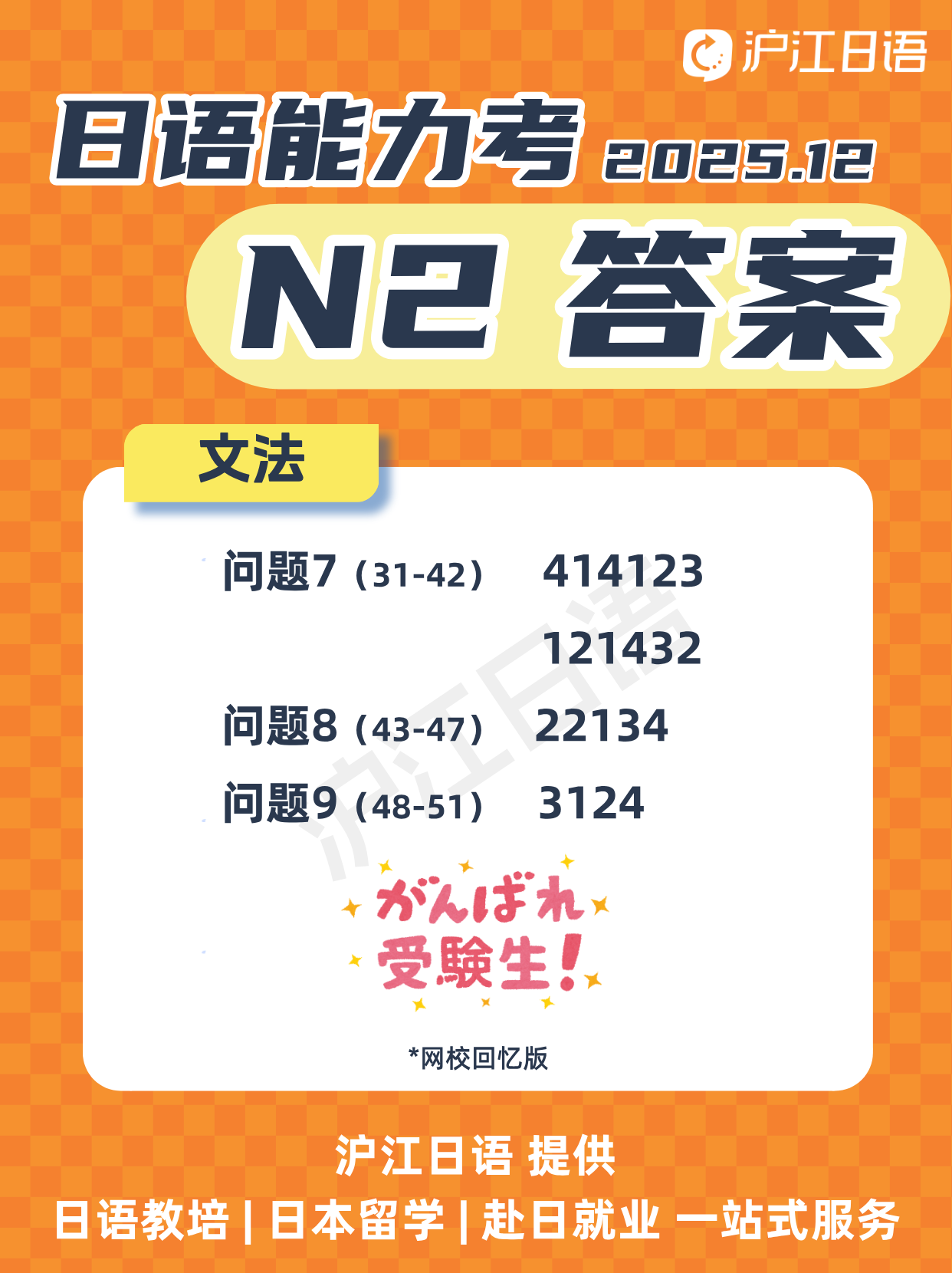 2025年12月日语能力考N2语法答案(沪江网校)