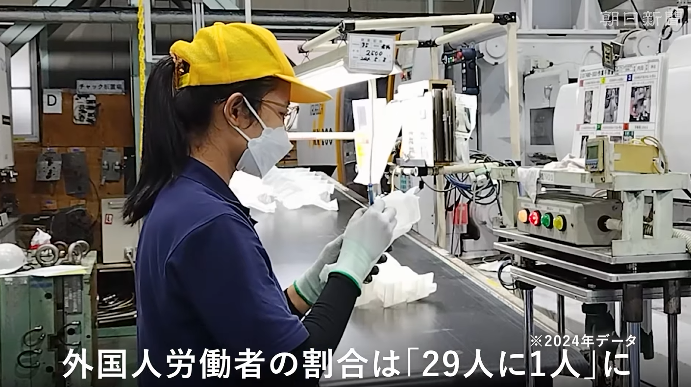 据日本总务省和厚生劳动省的统计数据对日本劳动者中的外国人比例进行计算后发现,2009年雷曼危机后外国人比例为1:112,到24年已经升至1:29。以小学班级学生为例,相当于从每4个班级当中有1名外国人提高到每1个班级中就有1名外国人。由于人口数量减少和老龄化进程加剧,15~64岁生产年龄人口骤减,外籍劳动者比例正在急速上升。