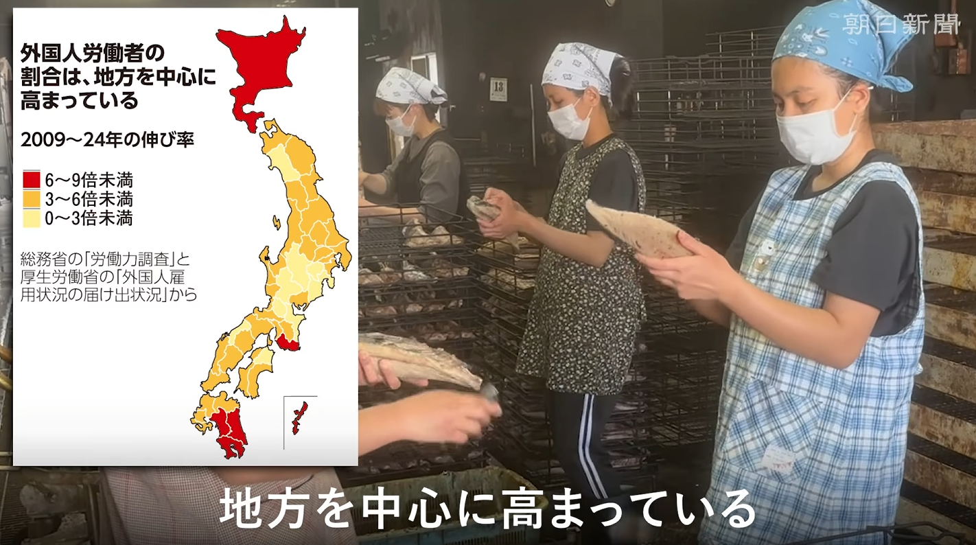 総務省と厚生労働省の統計から、日本で働く労働者のうち外国人の割合を算出したところ、リーマン・ショック後の2009年は「112人に1人」だったが、24年には「29人に1人」に高まった。小学校にあてはめれば、4クラスに1人から、1クラスに1人の割合となった。人口減と高齢化で、15~64歳の生産年齢人口が減る中、外国人の割合が急速に高まっている。