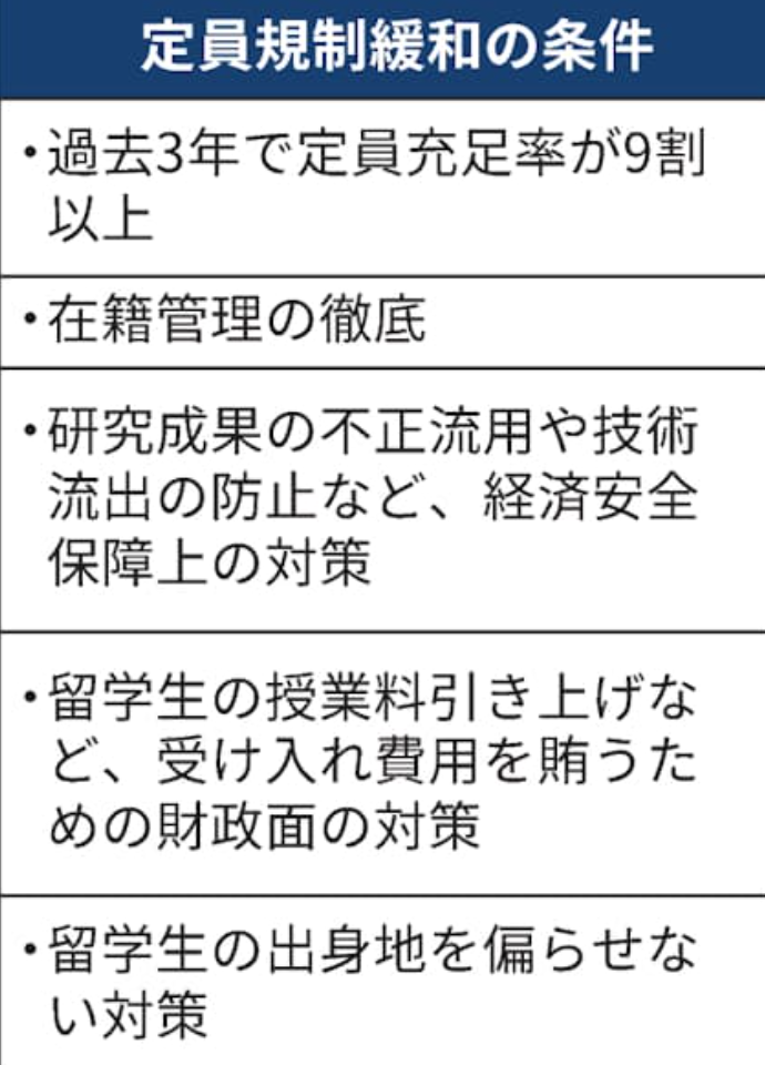 現行制度では、留学生を含めた学生数が定員を一定以上超過した大学には、国からの補助金が削減されるなどのペナルティーが科せられる。特例として、文科省が認定した大学が留学生受け入れを増やす場合に限り、定員超過の上限を引き上げる。入学定員が300人以上の学部の場合、超過上限を105%未満から110%未満に緩和する。