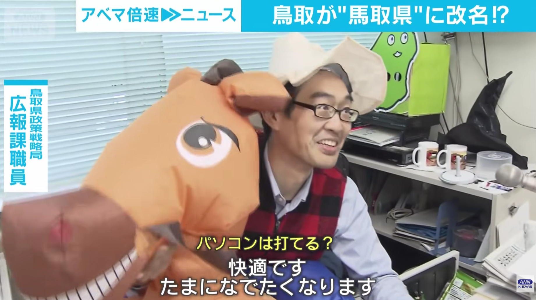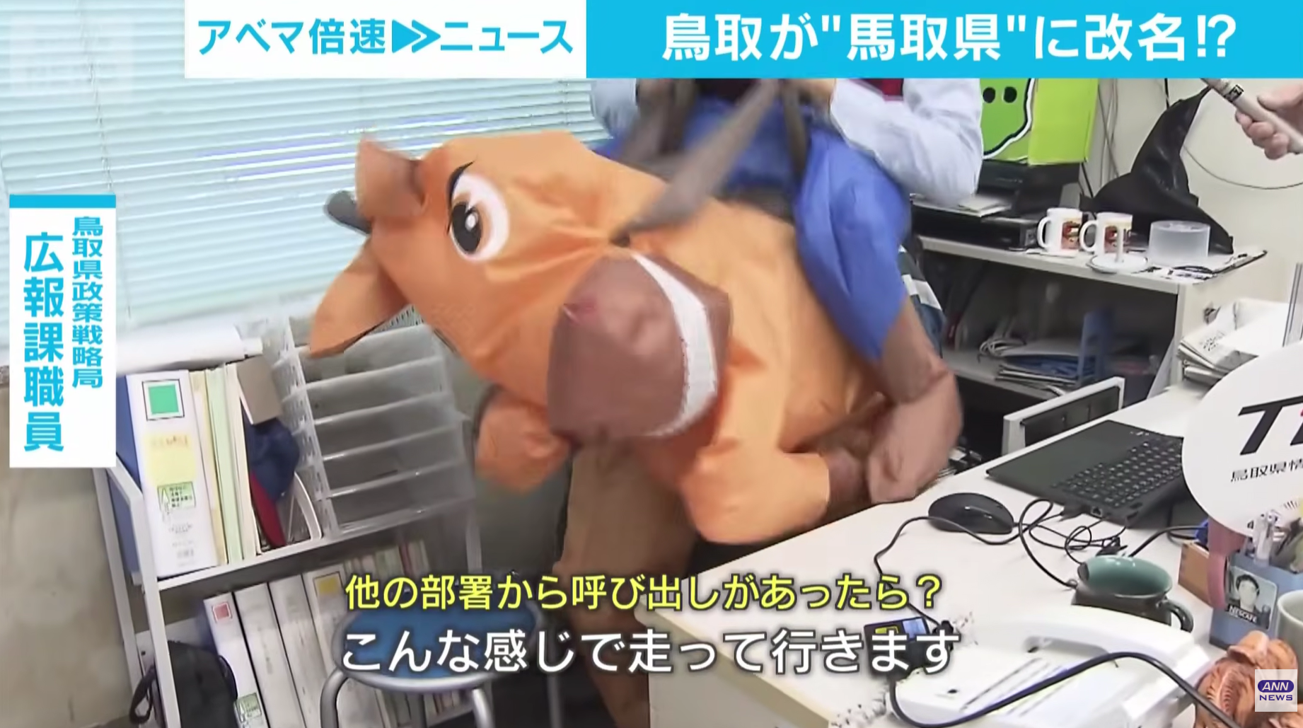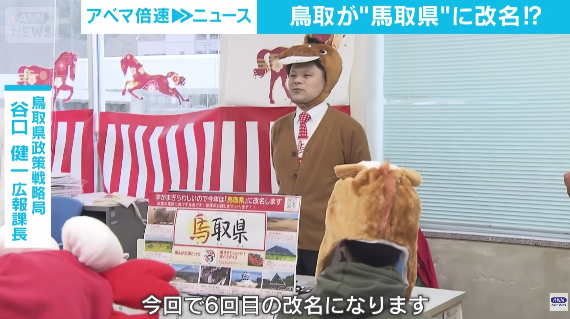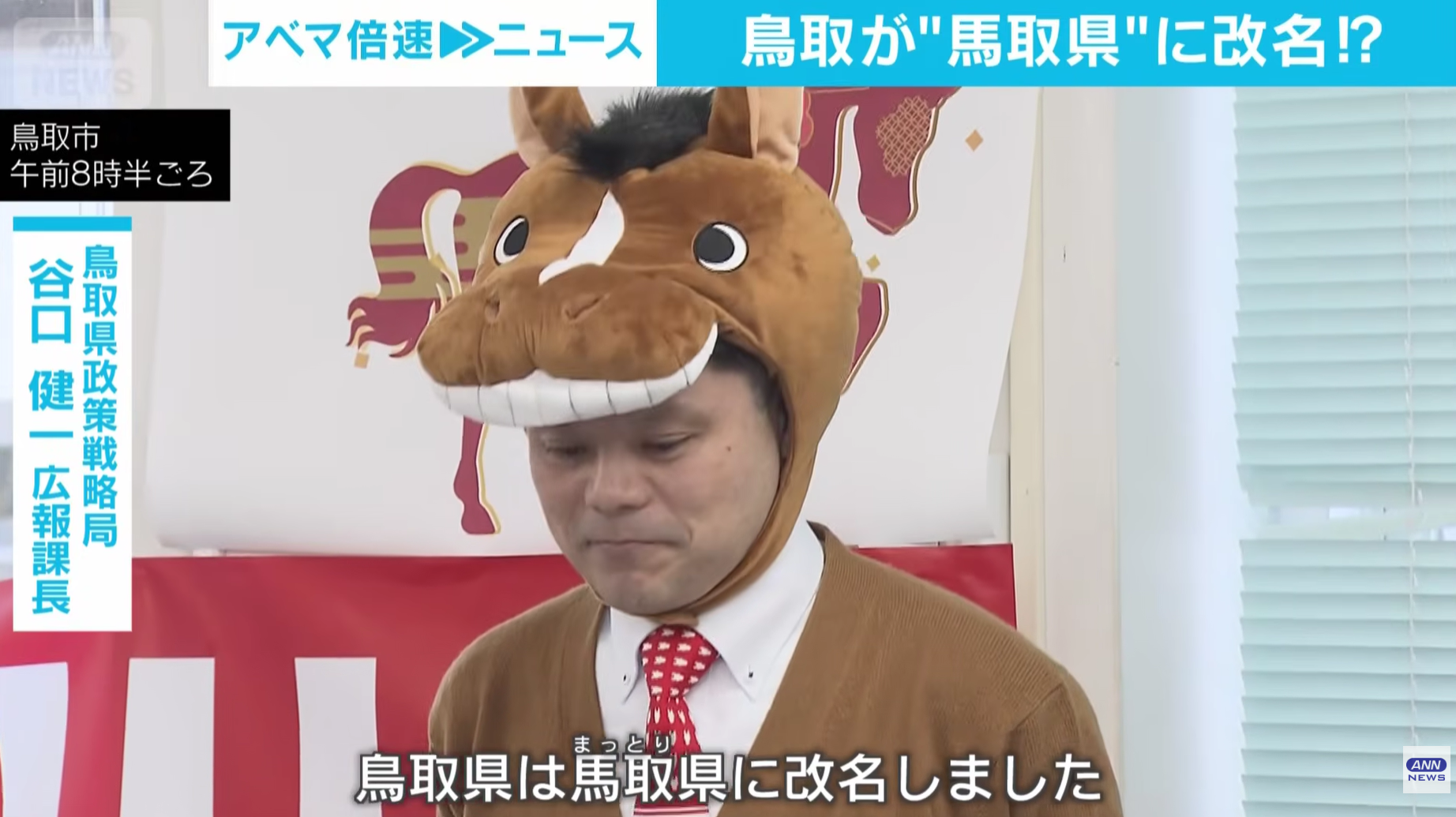 【谷口健一広報課長】「鳥取県(とっとりけん)は馬取県(まっとりけん)に改名しました」
