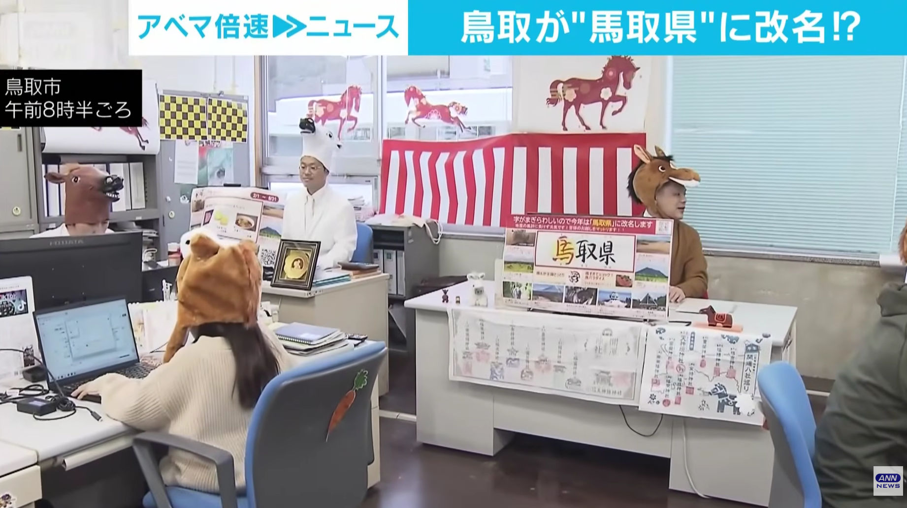 鳥取県の広報課職員は26日、2026年の干支(えと)である馬にちなみ、県が同年の観光施策のキャッチフレーズを「馬取県(まっとりけん)」としたことを受けて県庁舎の職場で馬のかぶり物を着用して働いた。県のSNSなどを通じて発信し、観光需要を喚起する。