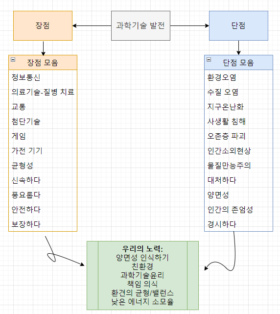이렇듯 양면성을 가진 과학을 올바르게 발전시키기 위해서는 첫째, 기술 개발 시 인간의 존엄성을 지킬 수 있도록 신중한 개발이 필요하다. 둘째, 과학자의 책임 의식과 과학기술윤리를 강화 해야한다. 셋째, 친환경 개발 기술을 발전시켜야 한다.