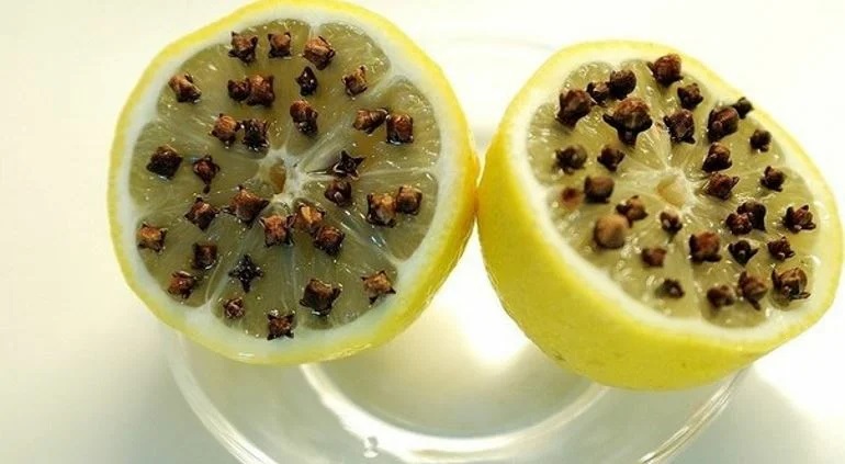 在切成两半的柠檬果肉上扎10-15粒丁香香料,把它变成刺猬一样。