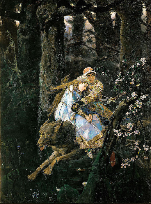 瓦斯涅佐夫在这件富有幻想的作品中,抒发了自己鲜明的思想感情,表现出对不幸者的同情,对邪恶的仇视,对光明和正义的歌颂。王子带着美丽的公主奔向光明,永远脱离黑暗。画面以深重密林作背景突出明亮的人物,画中人驾驭着灰狼由右向左奔驰,极富运动感。