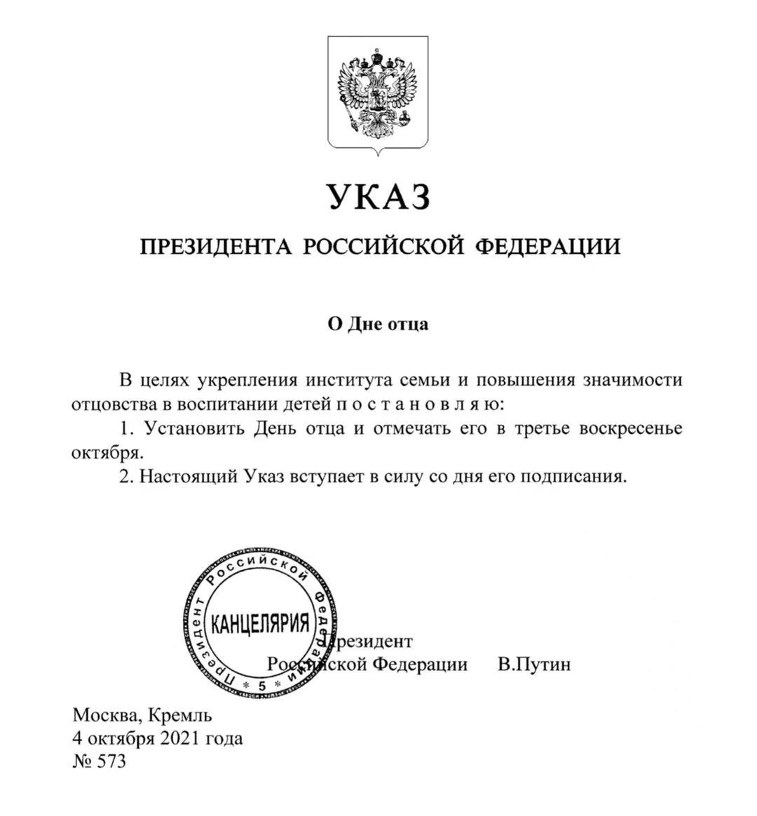 В России в третье воскресенье октября будет отмечаться День отца. Указ об этом подписал президент Владимир Путин. Об этом говорится в указепрезидента, опубликованном на портале правовой информации. Подписанный президентом документ вступил в силу в понедельник, 4 октября. Таким образом, ближайший общенациональный День отца Россия отметит 17 октября 2021 года.