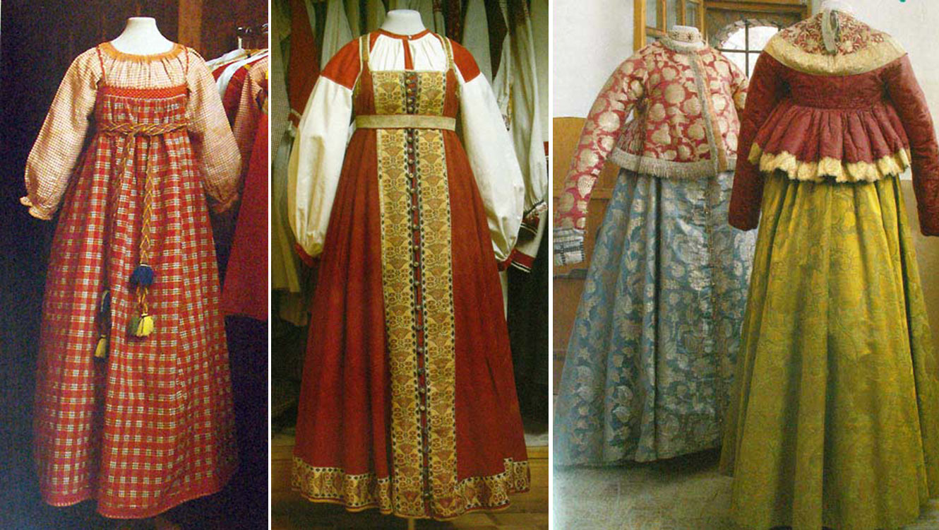 俄罗斯女性民族服饰可能是宽大的无袖长衫和毛料裙子。第一种广受北部地区居民青睐,而第二种在南部地区很受欢迎。这类衣服的内搭是一件宽敞的衬衫,用天然织物——亚麻或棉布缝制而成。上流阶层的女性则会选择更昂贵的布料,例如丝绸。