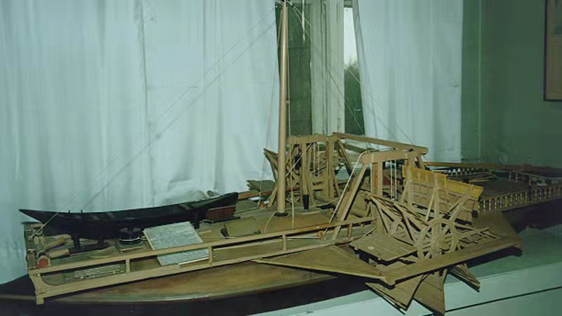 水车,一种依靠河流流动前进的船。特制的木质舵轮转动木质鼓轮,鼓轮上缠绕着抛锚绳,在行进过程中人工向上抛锚。虽然这种交通工具(库利宾共发明了两只这样的船)行进缓慢,但是纤夫再也不用费大力气拉船。遗憾的是,叶卡捷琳娜二世认为纤夫是价格更低廉的动力装置,因而这位伟大发明家的想法未能得以实现。