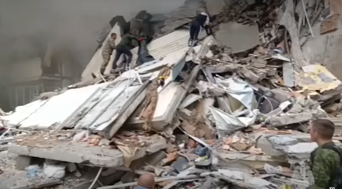 坍塌的居民楼位于邵尔斯大街。乌克兰炮弹落在了第三单元楼,随后该单元完全倒塌。