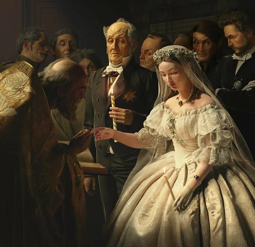 瓦西里·普基列夫的《不相称的婚姻》是一幅创作于1862年的布面油画,尺寸为173cm×136.5cm,现收藏于莫斯科特列季亚科夫美术博物馆。这幅画以其深刻的社会批判和现实主义风格而著称,展现了一位年轻少女与一位年迈将军的婚礼场面。《不相称的婚姻》在1863年展出时引起了巨大轰动,尽管遭到官方的反对,但它仍然成为了19世纪60年代俄国文学和美术进一步揭露和批判社会弊病的重要作品之一。