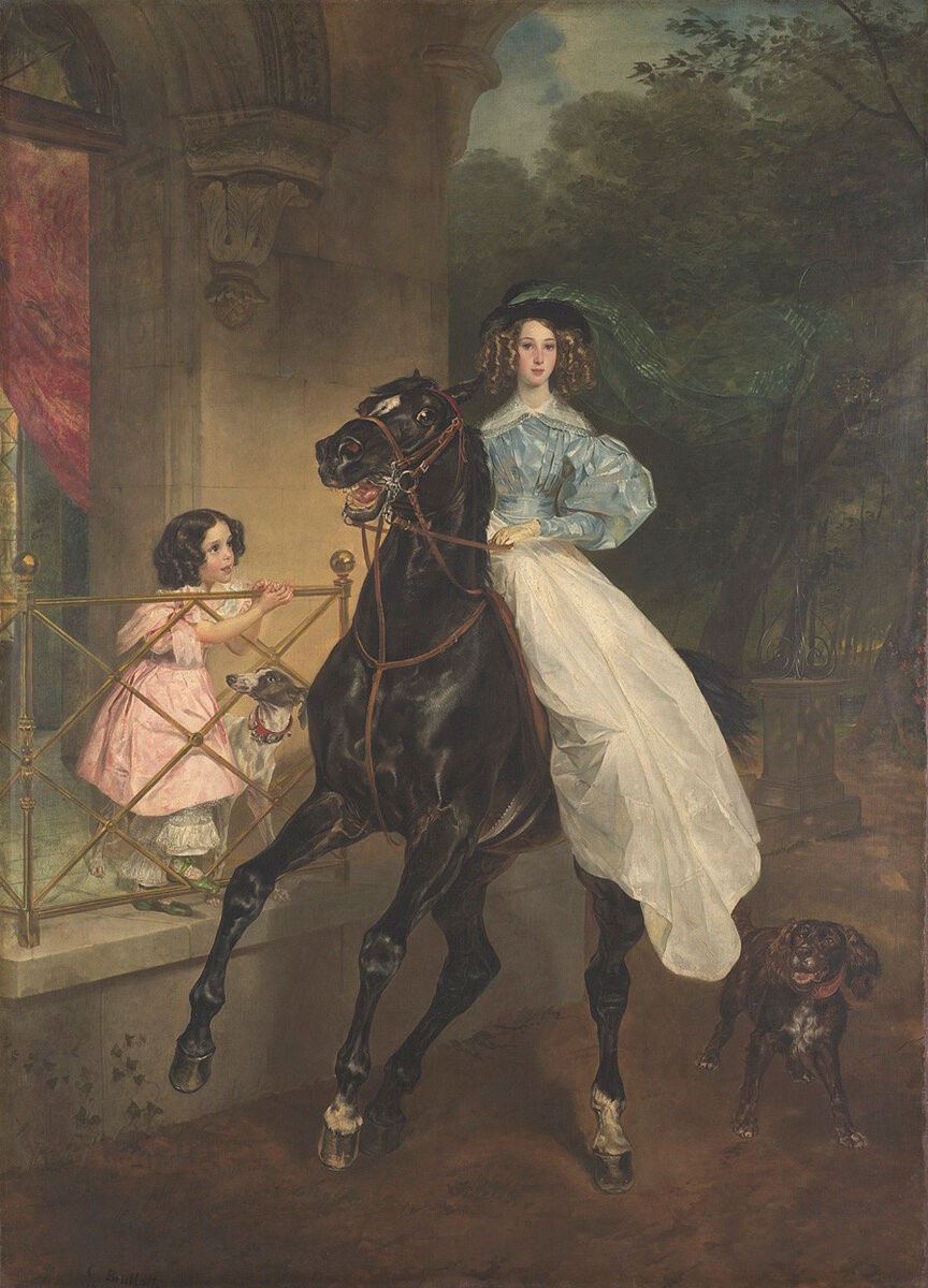 卡尔·巴甫洛维奇·布留洛夫是俄国19世纪上半期学院派的代表大师,以其历史画和肖像画著称。他的作品《女骑士》是肖像画的典范之一,创作于1832年,现收藏于莫斯科特列季亚科夫画廊。画中人物是乔瓦尼娜与阿玛齐莉娅·帕齐妮姐妹,布留洛夫的好友尤·巴·萨莫依洛娃的养女。