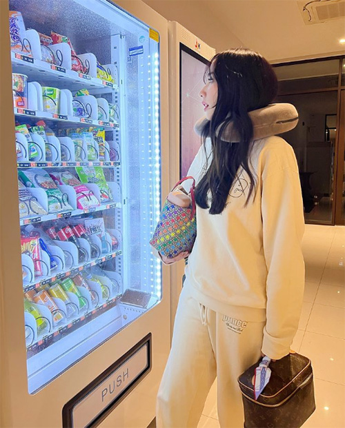Gubgib 身穿一件露脐上衣搭配白色的休闲裤,外披白色的厚夹克,搭配休闲鞋。这一身运动休闲look露着小性感。