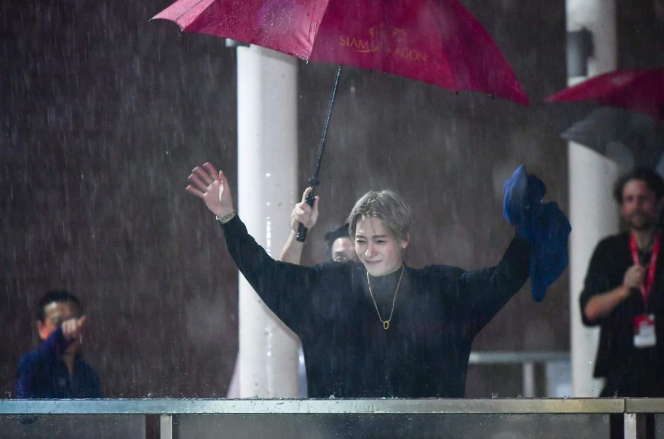 Jackson来泰国的时候刚好是泰国雨季,所以几乎每次出席活动时都在淋雨。有一次活动现场下起了大雨,王嘉尔拒绝了主办方坚持进行活动的要求,他冒着雨送别在现场等待观看表演的粉丝们,让他们赶紧回家,这举动让大家都觉得很暖心,让人更加喜欢他了。