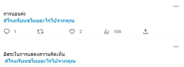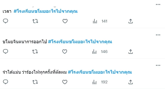 หลายคนบนโลกโซเชียลได้โพสต์ข้อความ ตอบคำถาม #โรงเรียนขโมยอะไรไปจากคุณ มีทั้งคำตอบในแง่ลบ แง่บวก ทั้งจากคนที่เป็น นักเรียน ผ่านวัยเรียนมาแล้ว รวมไปถึงคนที่กำลังทำอาชีพ ครู ได้โพสต์แสดงความเห็นกันอย่างมากมาย
