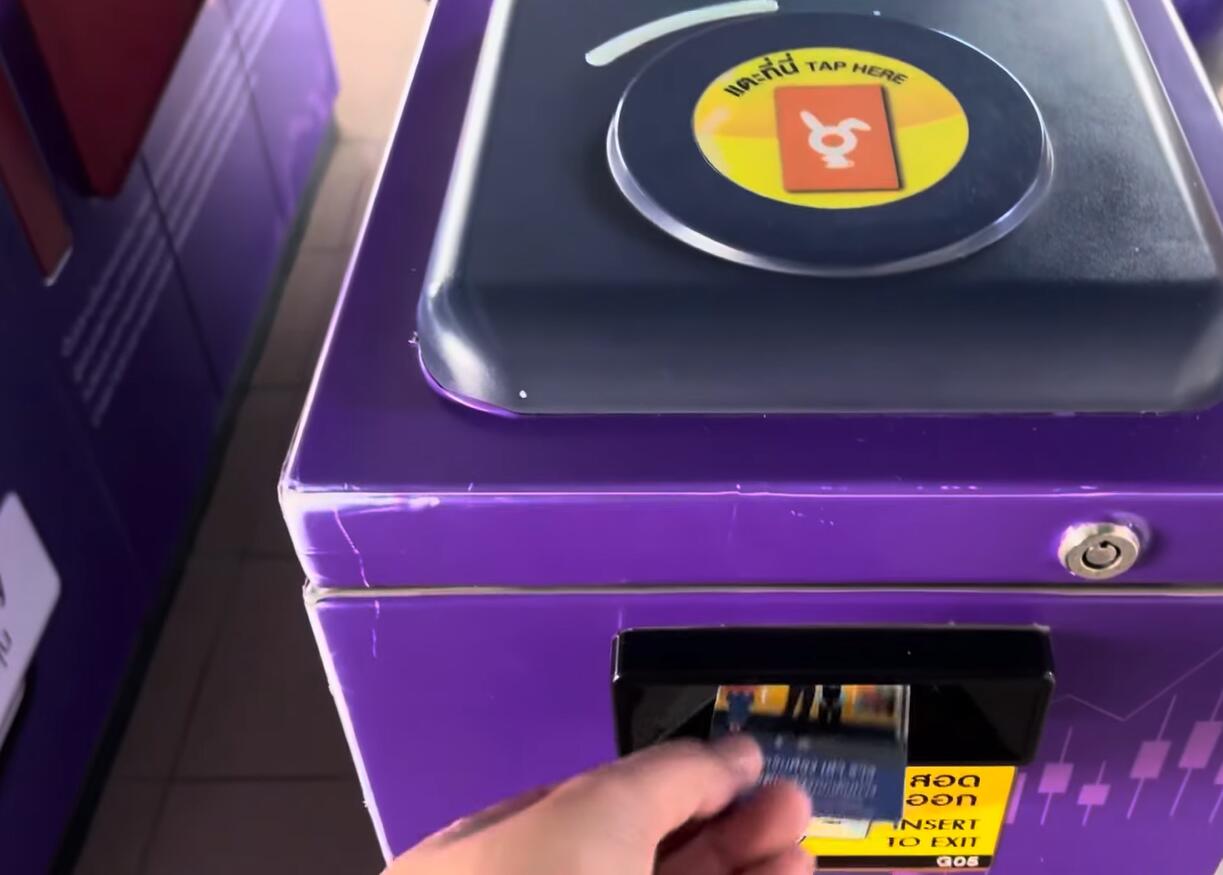 นำเหรียญโดยสารสอดคืนที่ช่องทางออกที่มีลูกศรเหลือง และประตูจะเปิดให้เราเดินออกไป