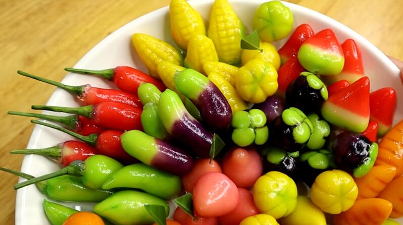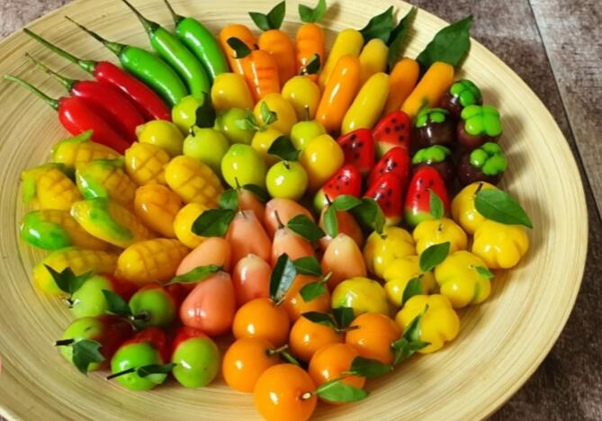 露楚,是一种色彩鲜艳、看着让人垂涎欲滴的泰式甜点,它甜甜的味道非常独特,原材料是绿豆,内陷是蒸熟的剥皮绿豆、椰浆和砂糖。搅拌起来后,捏成各种不同水果、蔬菜的形状,然后串成串,将其沾上可食用色素,外层涂上果冻,就成为了漂亮的小甜点。露楚比较受欢迎的形状是:橙子、莲雾、草莓、芒果、西印度醋栗、茄子、胡萝卜、枣子、山竹、辣椒、香蕉等。但现在露楚能做的形状更加多了,还能做动物、卡通人物、食物以及其他有趣的造型。
