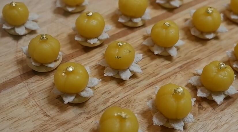 金冠蛋糕是一种非常新奇美丽的金黄色泰式甜点,看起来像皇冠。底部用面粉打底,上面撒有裹满糖的西瓜籽片,在甜品周围连接成一圈格栅图案,顶部贴有美丽的金箔。这是一种要花很长时间制作的甜点,制作方法也非常精细,味道香甜、浓郁、美味。