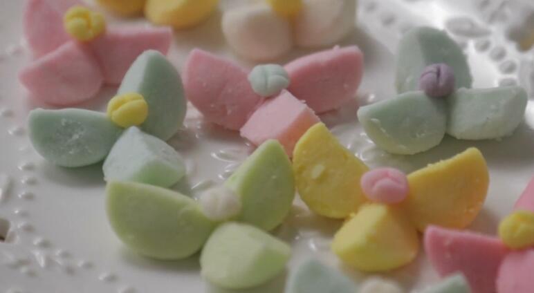 桑帕尼是婚礼仪式上常用的吉祥甜点,因为过去人们相信桑帕尼小吃名字的含义是“亲爱的”,当吃下去的时候,甜点会在你的嘴里慢慢融化,你会感受到芬芳和甜蜜,感受到思念、爱和关怀。桑帕尼甜点是由炒木薯粉制成的,揉捏之后与椰浆、砂糖混合,根据需要添加颜色并压入模具中,也可以拿去用香再熏一会儿。桑帕尼普遍被制成各种花朵形状,有很漂亮的颜色,还有甜味,能尝到其在嘴里融化的味道。