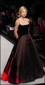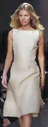 这个模特身上的礼服简约大气,英文称它为A-line dress(A线礼服):上部窄,向下逐步呈喇叭状展开(flaring gently wider),象字母A