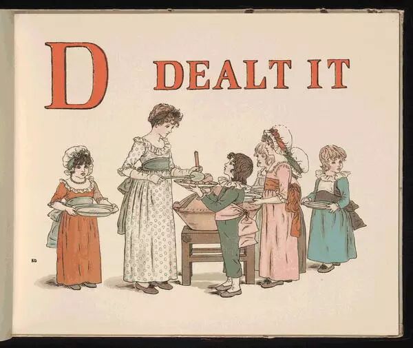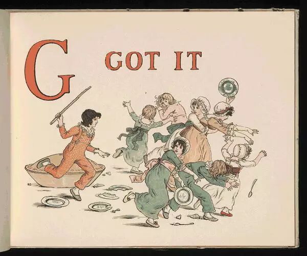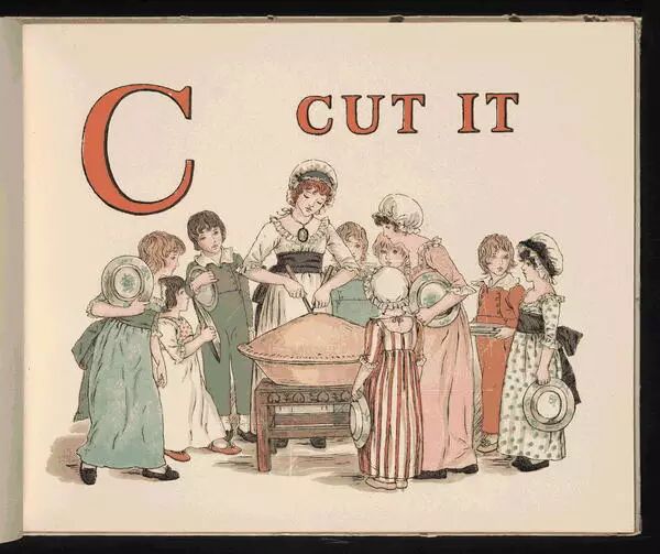 Kate Greenaway的这本绘本,就像这 样,告诉了孩子们可以对一只苹果派做些什 么: "a apple pie, bite it, cut it, dropped it, enjoyed it, fought for it, got it, hoped for it”…… 一直从A到Z,通篇用了这样的模式。
