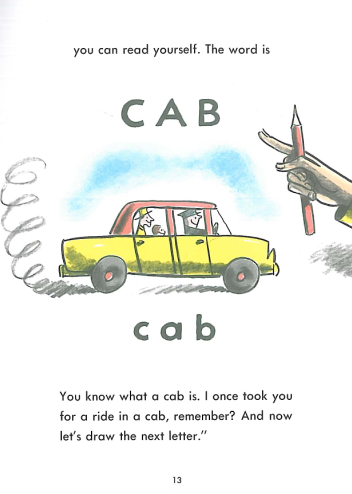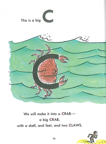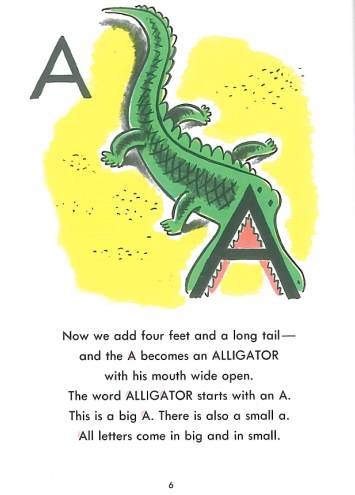 我刚才说过,这部绘本在创作上,有一个可喜的特点, 就是把英文大写(以及小写)字母,与各种动物的形状,或者与生活中常见物品的形状结合起来。比如,主人画大写字母 A 的时候,就把 A 的形状比作鳄鱼 张开的大嘴,字母 A 一下子变得鲜活起来,一下子让孩子记住字母 A 的形状。