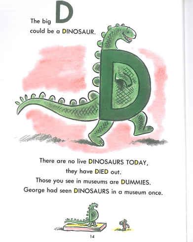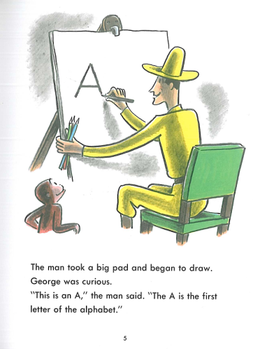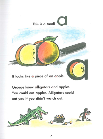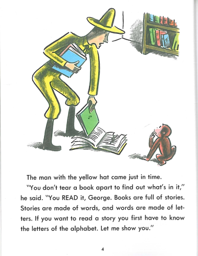 后来,乔治把书撕开,想看看里面藏了一些什么东西。恰好,带着黄帽子的主人走过来,制止了猴子的撕书行为,主人对猴子说:“乔治,书是用来读的。书里有各种故事。故事由单词组成。单词由字母组成。如果你想读故事,首先要学习字母表。英语有哪些字母呢?让我来画给你看。”