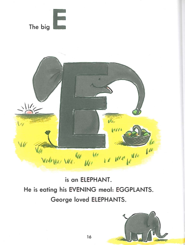 接下来和大家分享的这一本,同样作为字母书,但是学字母的方式又不一样了哦,它主要是通过把字母形象化,利用字母的外观、样子、形象,从而让孩子通过阅读,学习字母,这本绘本就是H. A . Rey 创作的《好奇乔治学字母》(Curious George Learns the Alphabet),不光从字母发音入手,还从“象形记忆”入手,帮助孩子熟悉英文 26 个字母。